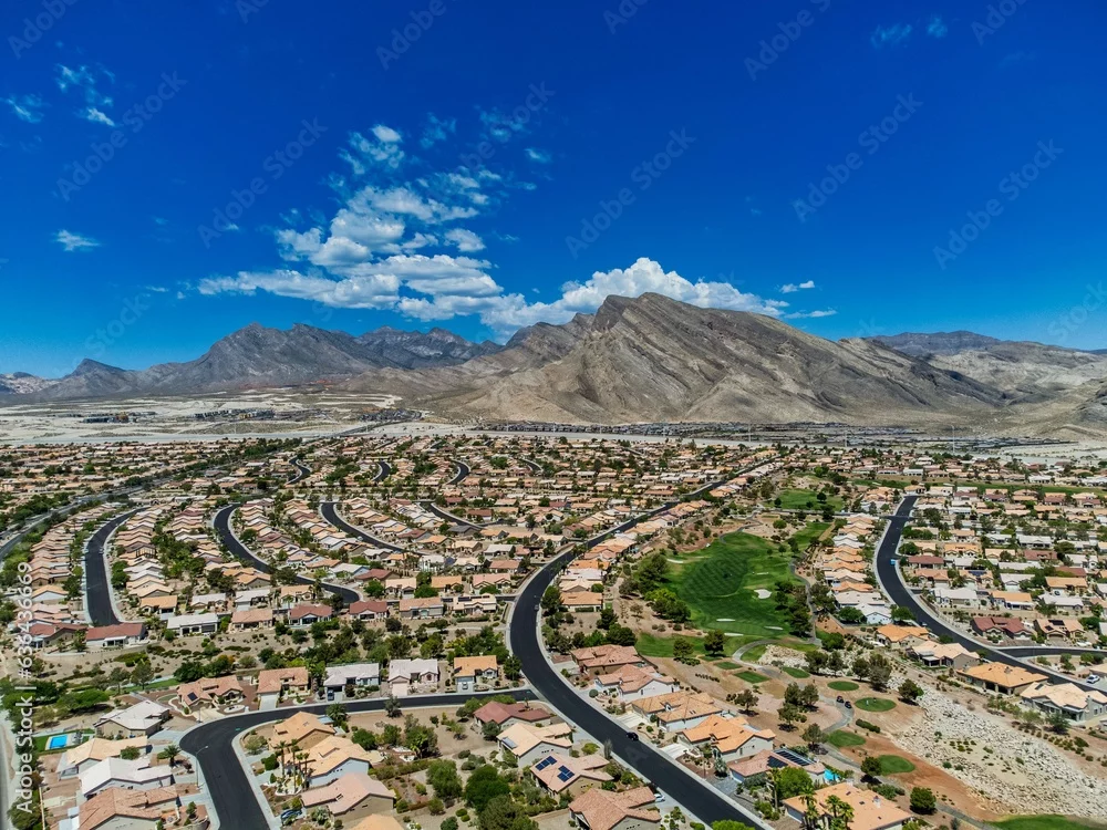 Aerial shot of the Summerlin under a blue sky and sunlight in Las Vegas, Nevada