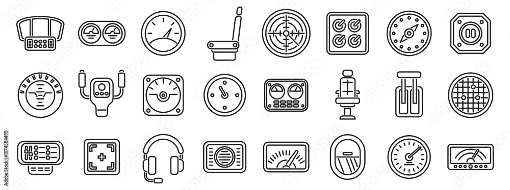 Airplane cockpit icons set. Airplane cockpit panel icons displaying various instruments, including speedometer, altimeter, artificial horizon, clock, seat, switches, headset, and digital instruments