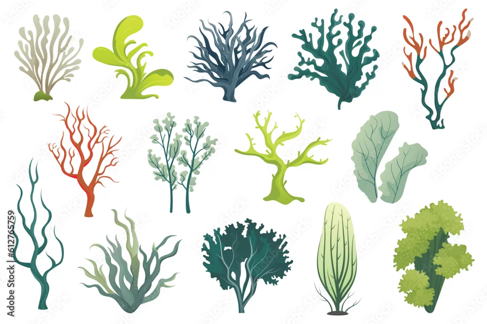 Algae set. This illustration set features flat, cartoon-style designs of various types of algae. Vector illustration.