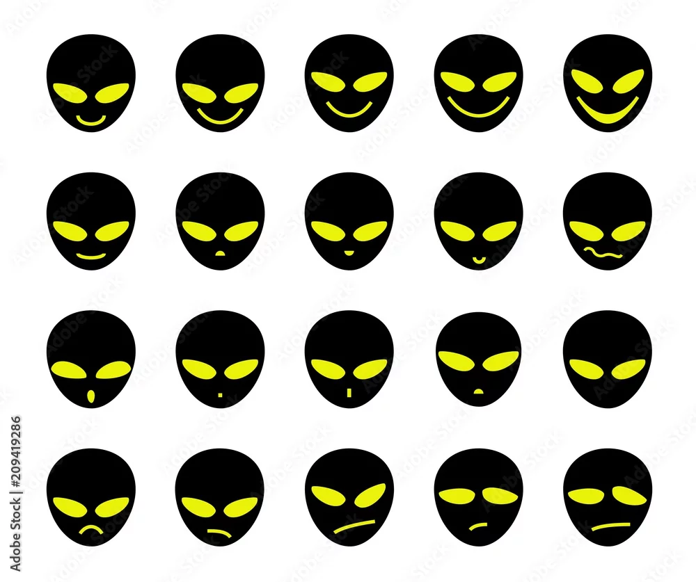 Alien, icon, different emotions, black, vector. The face of an alien. Meme, icon. Vector pictures on white background. Black faces with green eyes.