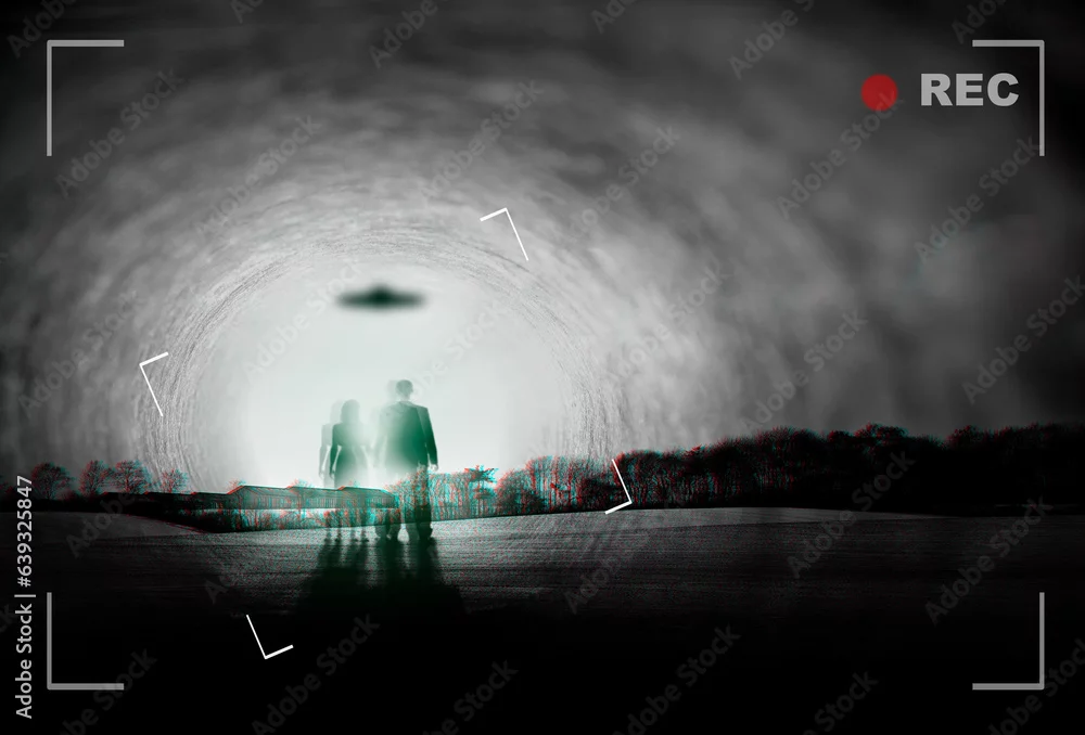 Alien, spaceship and people recording with UFO in sky in nature for fantasy, science fiction and space mission. Extraterrestrial, travel and silhouette in forest for abduction conspiracy on camcorder