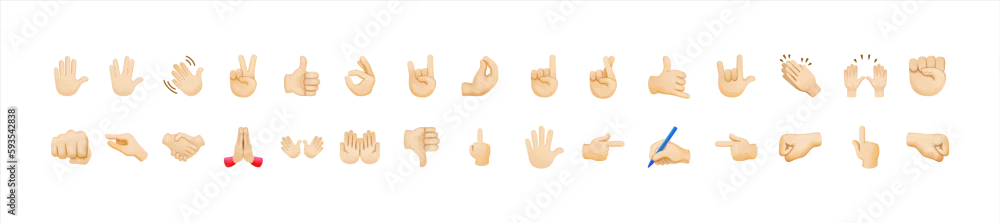All hand emojis, stickers in all skin colors. Hand emoticons vector illustration symbols set, collection. Hands, handshakes, muscle, finger, fist, direction, ...
