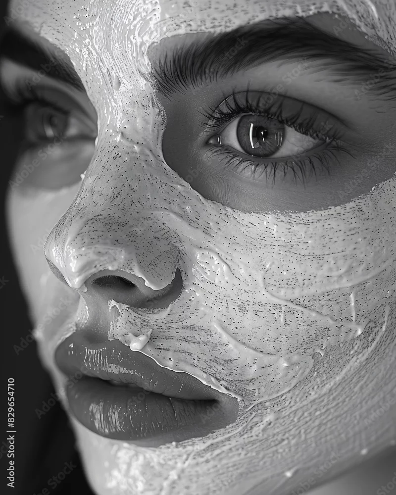 An English woman applies a white translucent face mask, the mask clings to her skin, facing the camera, the person is frontal, the mask covers her eyebrows, ...