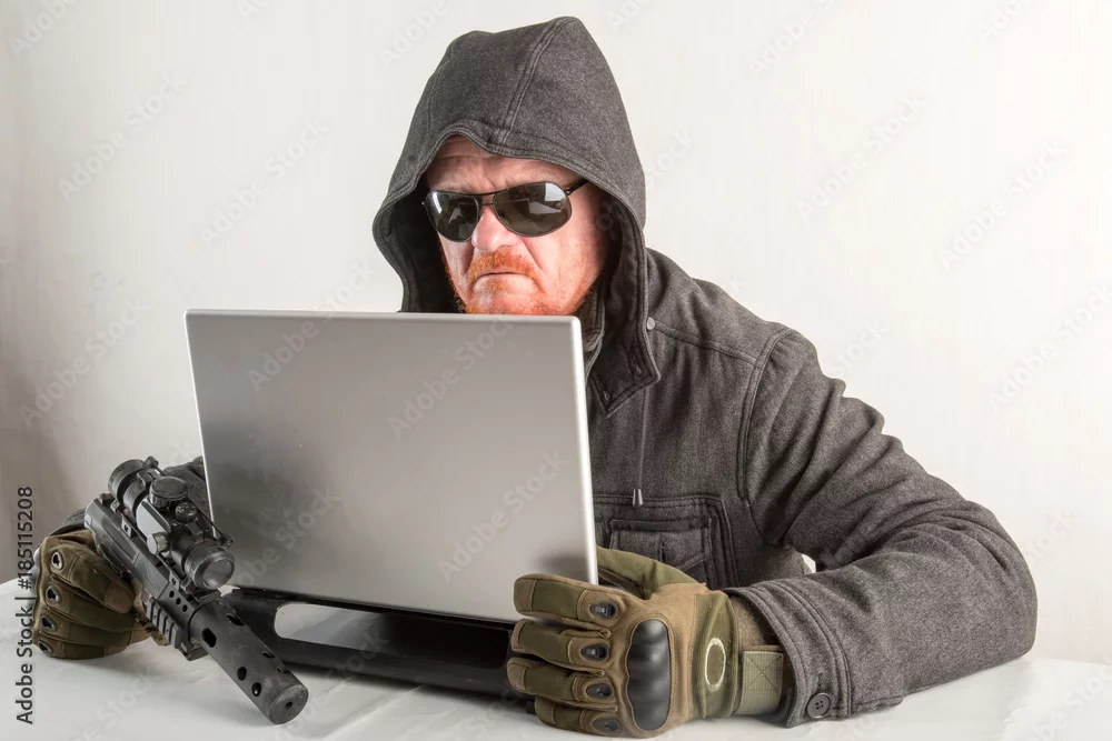 An evil hacker with a gun, red hair, a beard and a mustache. Penetration into the home, hacking laptop, emotion, cinema, sun glasses
