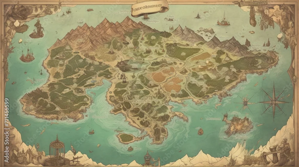 An intricate and sprawling fantasy world map detailing diverse continents, landscapes, and mythical realms - Generative AI
