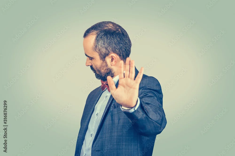 angry man giving talk to hand gesture with palm outward