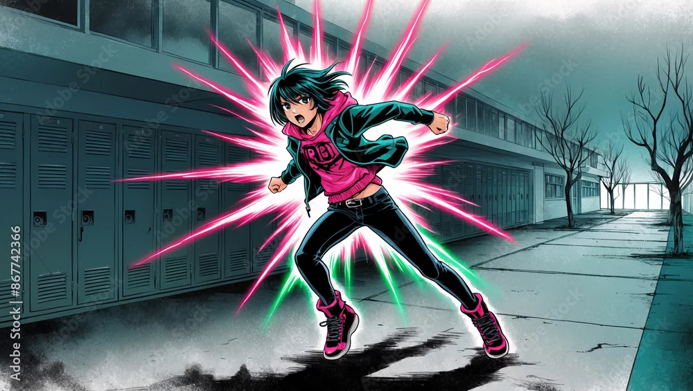 Angry Teenager Emo Boy or Girl like a Superhero with powers, manga anime japanese style in a horrific high school, horror dark story
