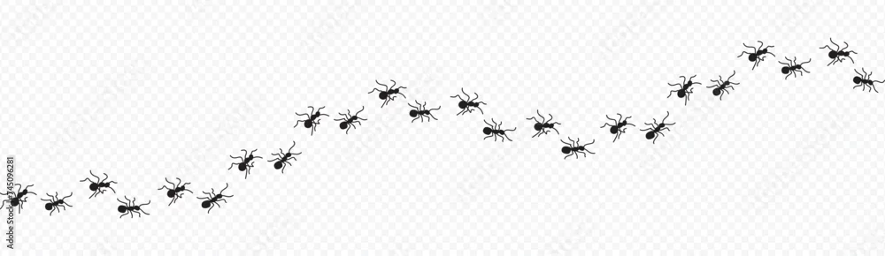 Ant trail. Little ant trail isolated on white backgrpund. Ants moving quickly in one direction. Ants moving in one row line. Group ants walk.