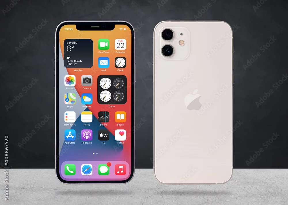 Antalya, Turkey - January 25, 2021: Apple iPhone 12 front screen and back side of the phone.