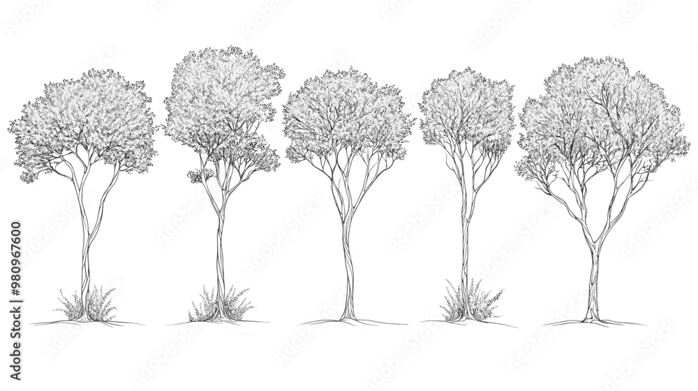 Architectural Drawings, Minimal style cad tree line drawing, Side view, set of graphics trees elements outline symbol for landscape design drawing. Vector ...