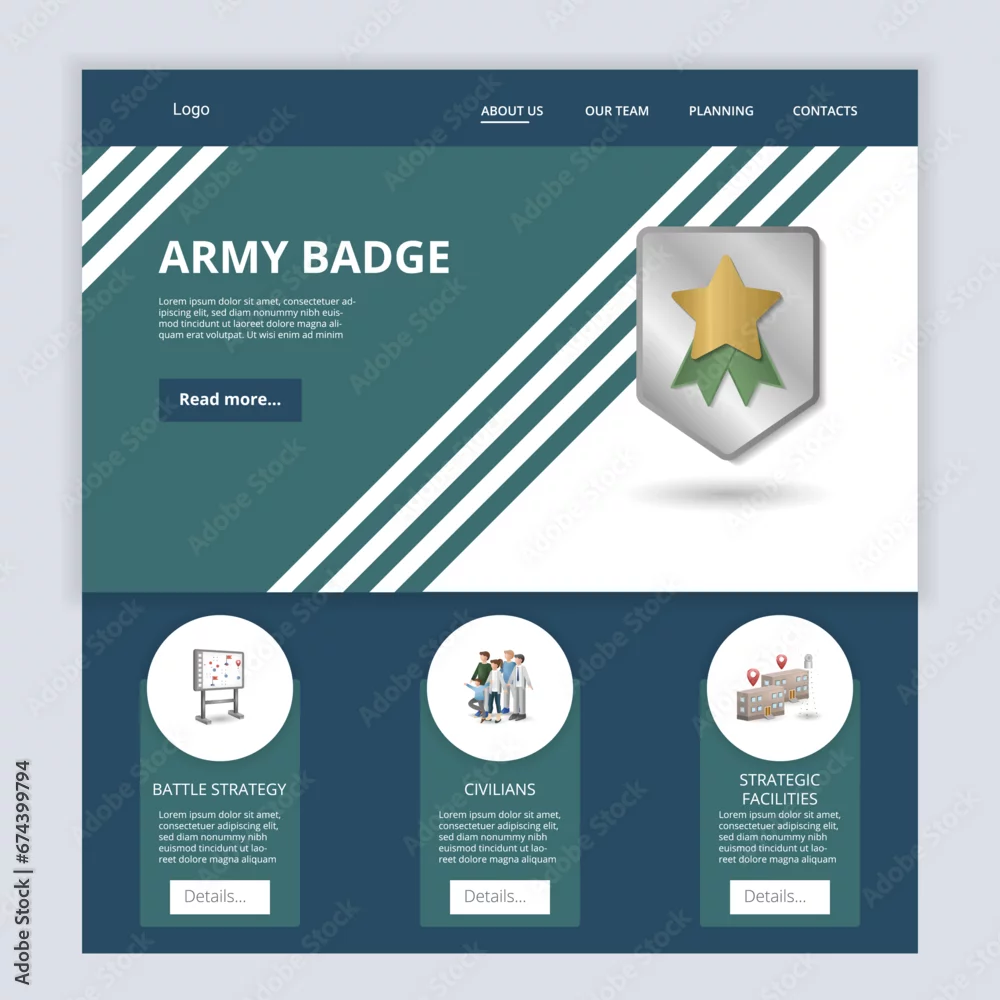 Army badge flat landing page website template. Battle strategy, civilians, strategic facilities. Web banner with header, content and footer. Vector i ...