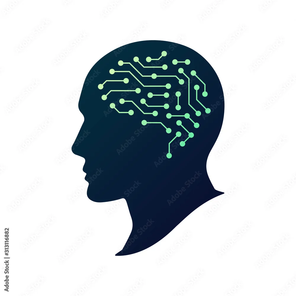 Artificial Intelligence AI vector logo. Artificial human brain. Human head silhouette. Neural network concept. Brain-shaped microcircuit