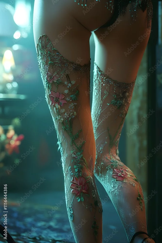 Artistic photo highlighting the legs of a beautiful woman reclining in see-through stockings with colorful, delicate red floral embellishments in a dark ...