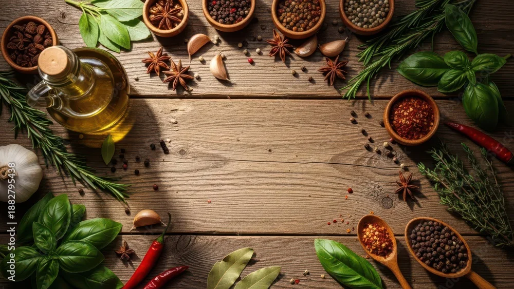 Assortment of fresh cooking ingredients and aromatic herbs on a rustic wooden table for food preparation
