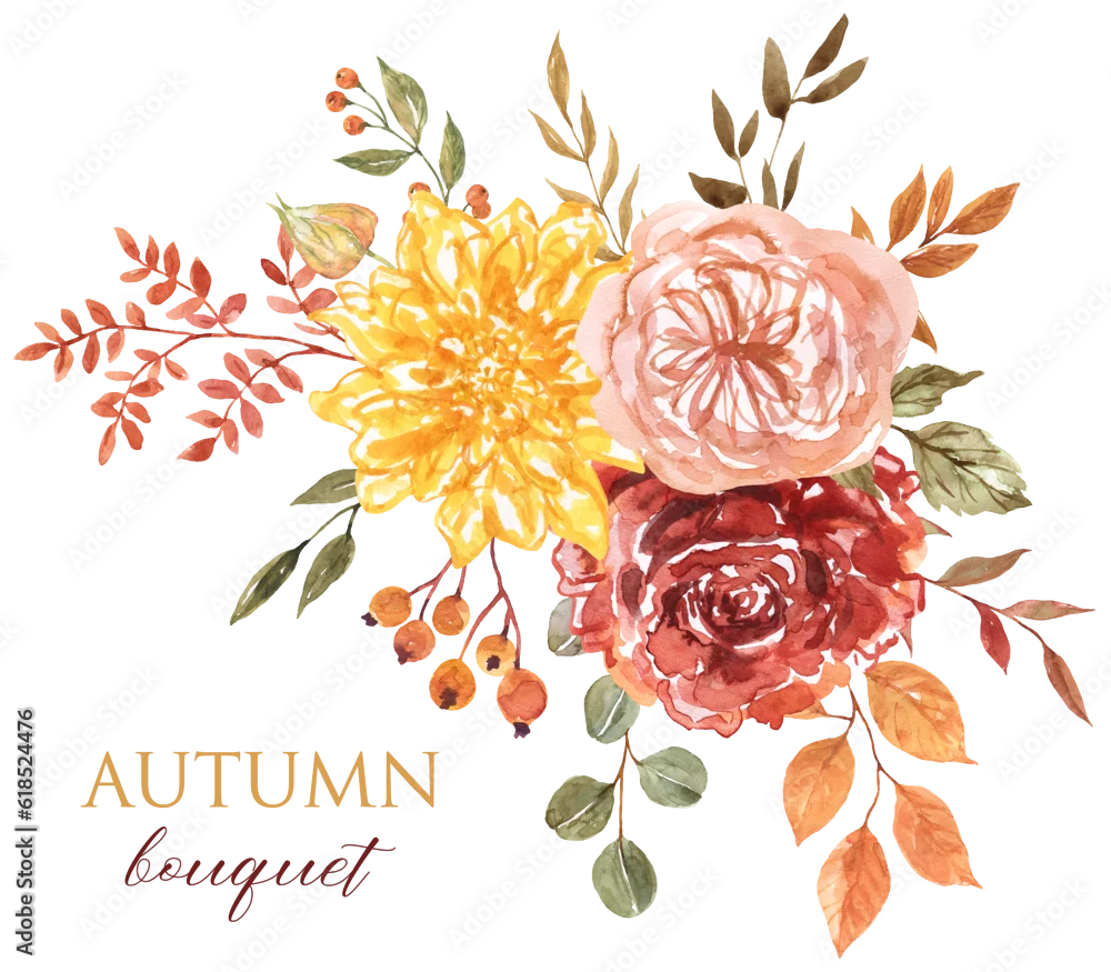 Autumn floral bouquet. Watercolor hand-painted fall flowers and tree leaves arrangement, isolated on white background. Botanical illustration. PNG cl ...