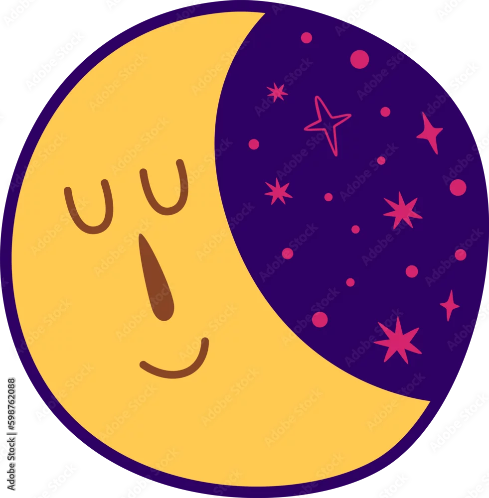 Baby moon face in PNG on transparent background. Cute kids moon character. Nursery sleeping moon childish illustration. Funny cheerful isolated eleme ...