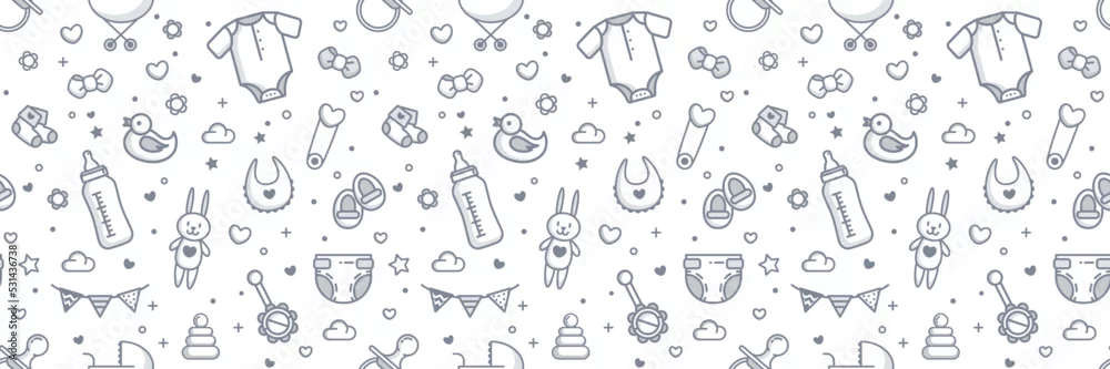 Baby Seamless Background In White and Gray Colors. Vector Cartoon Illustration