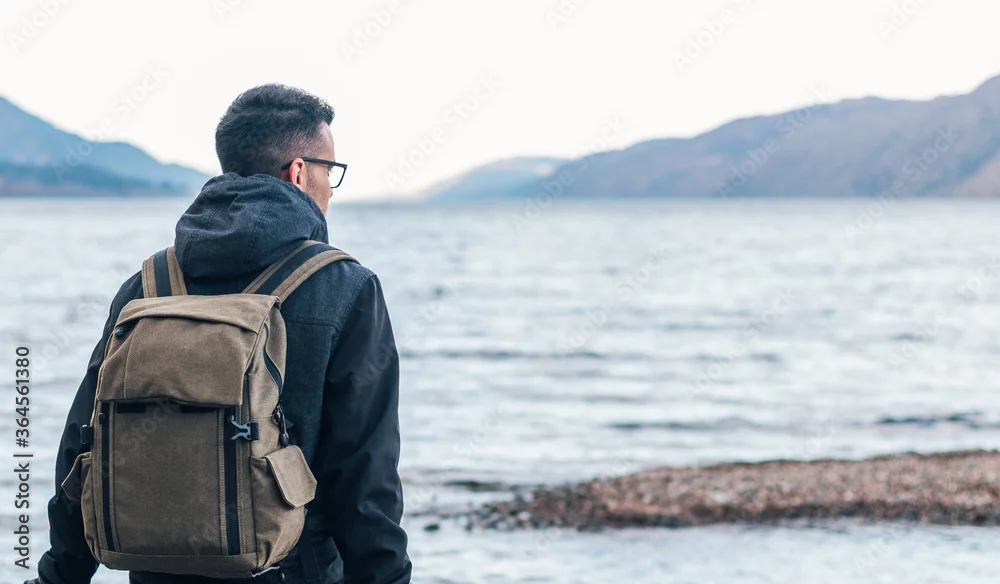 Back view of male hiker in warm jacket with backpack sitting on wooden bench near sea and enjoying marine scenery with rocky coast during travel in Scotland