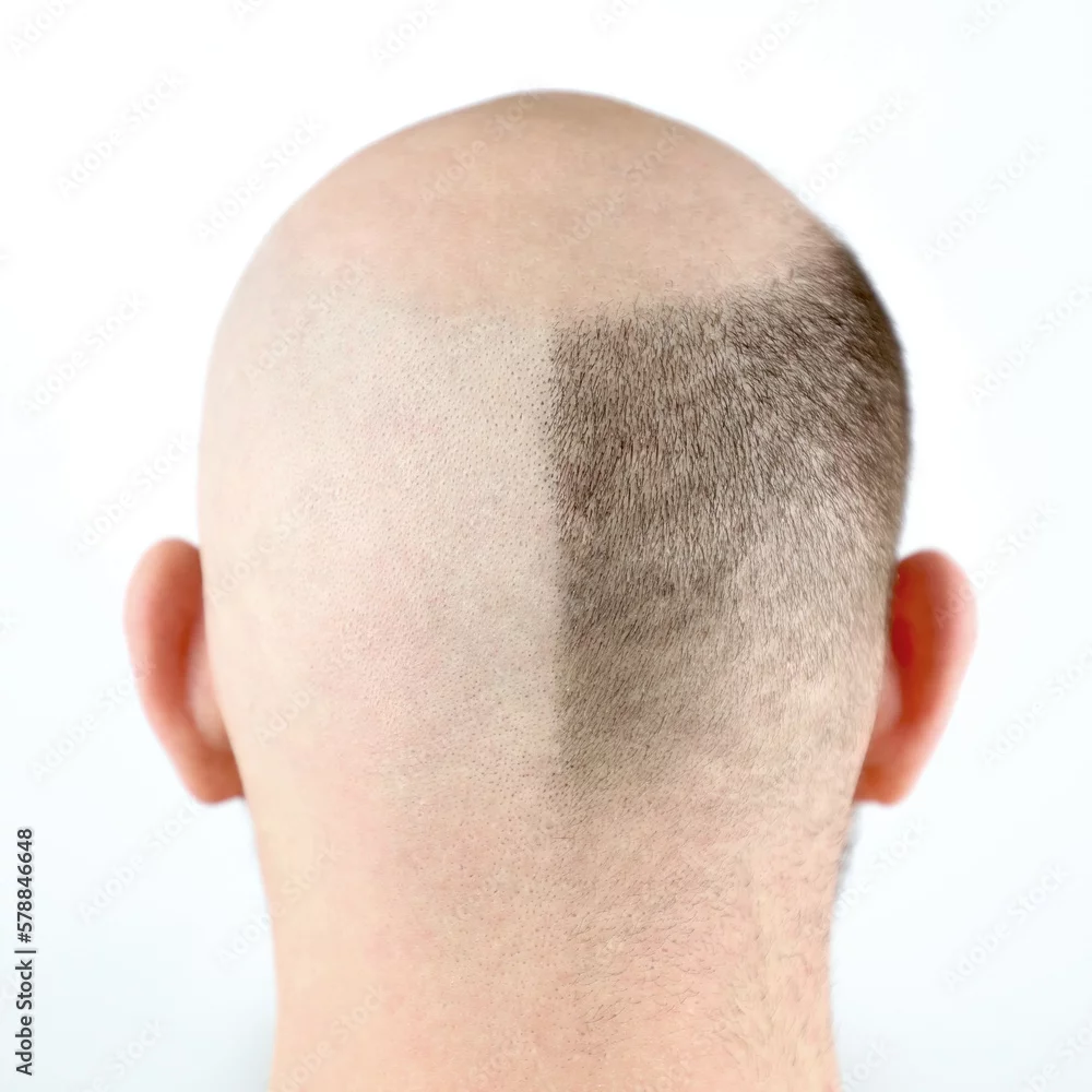 Bald man, rear view. Baldness close-up. Loss of hair on the head. Bald head. Hair transplantation, care and treatment. Severe baldness. Half-shaved head. ...