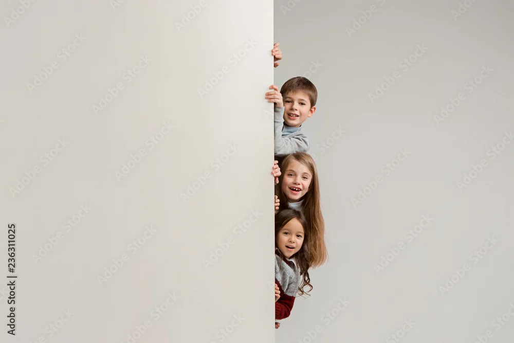 Banner with a surprised children peeking at the edge with copyspace. The portrait of cute little kids boy and girls looking at camera against white studio wall. Kids fashion and happy emotions concept