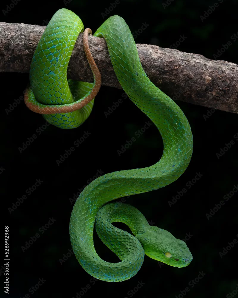 Barat Bamboo Pitviper (Trimeresurus popeiorum barati) on tree branch. Trimeresurus popeiorum barati is a venomous pitviper subspecies endemic to Indo ...