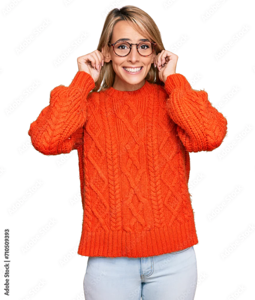 Beautiful blonde woman wearing casual clothes and glasses smiling pulling ears with fingers, funny gesture. audition problem