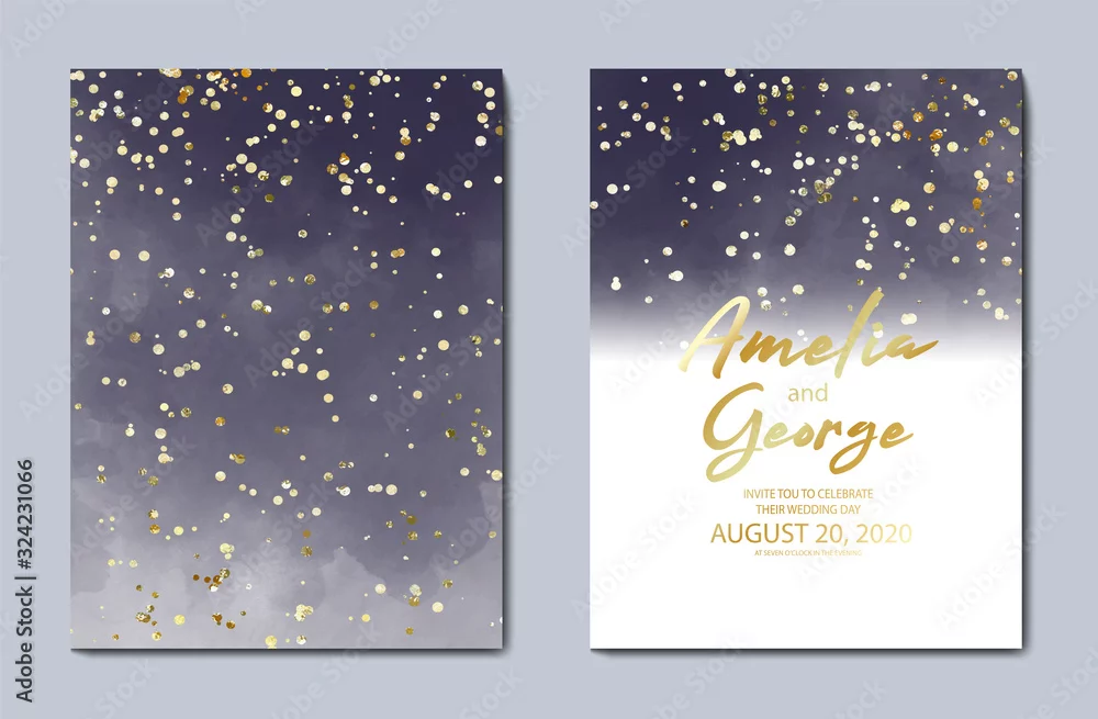 Beautiful dark blue water-colour background, great design for any purposes. Invitation ,Greeting card template. Vector gold glitter background texture.