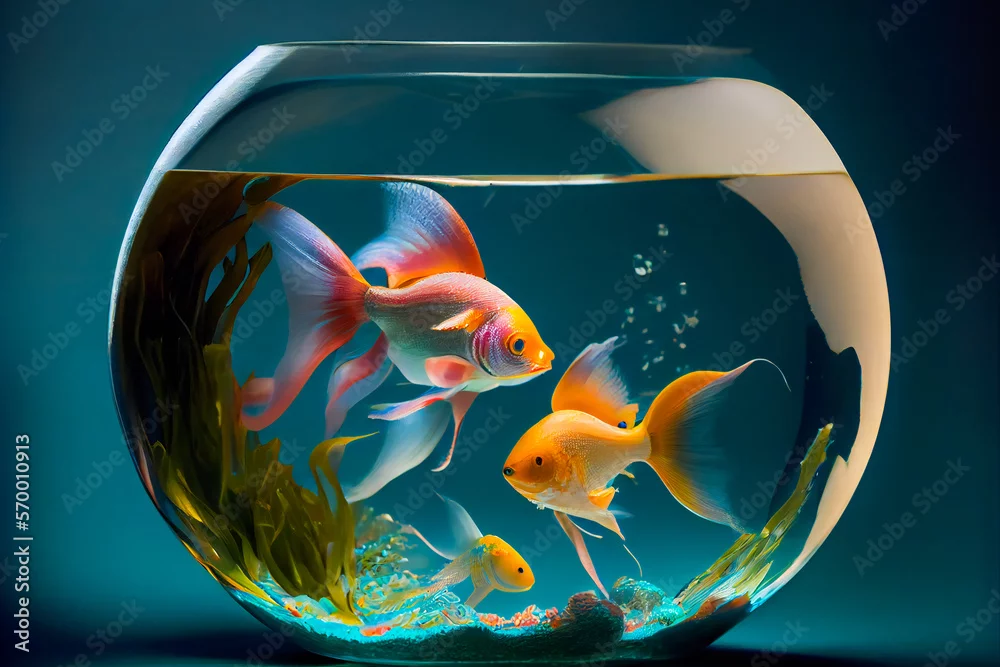 Beautiful fish in round glass aquarium. Fish Swimming In Fishbowl. Generative AI.