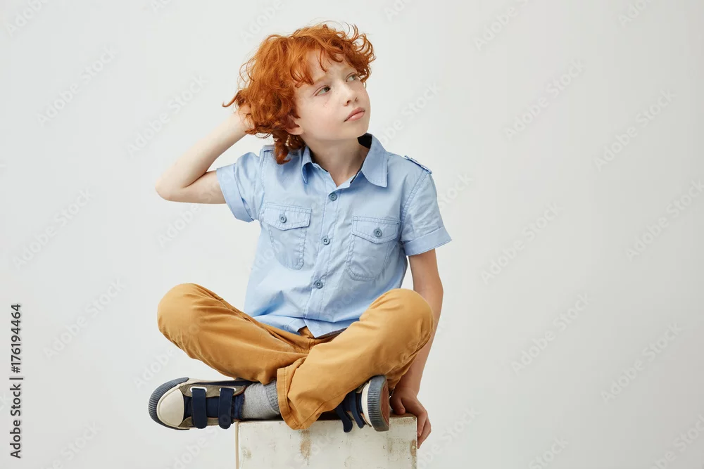 Beautiful ginger boy with curly hair and freckles in casual clothes holding hand on head, looking aside with relaxed expression.
