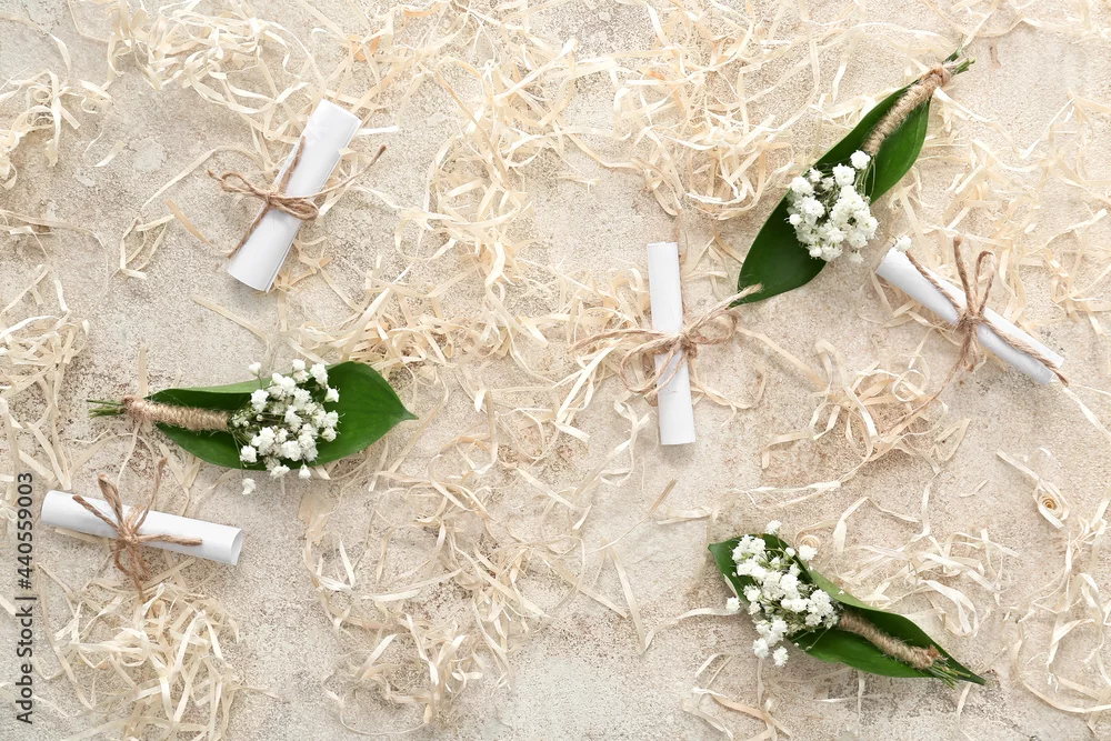 Beautiful gypsophila boutonnieres and wedding invitations on grunge background