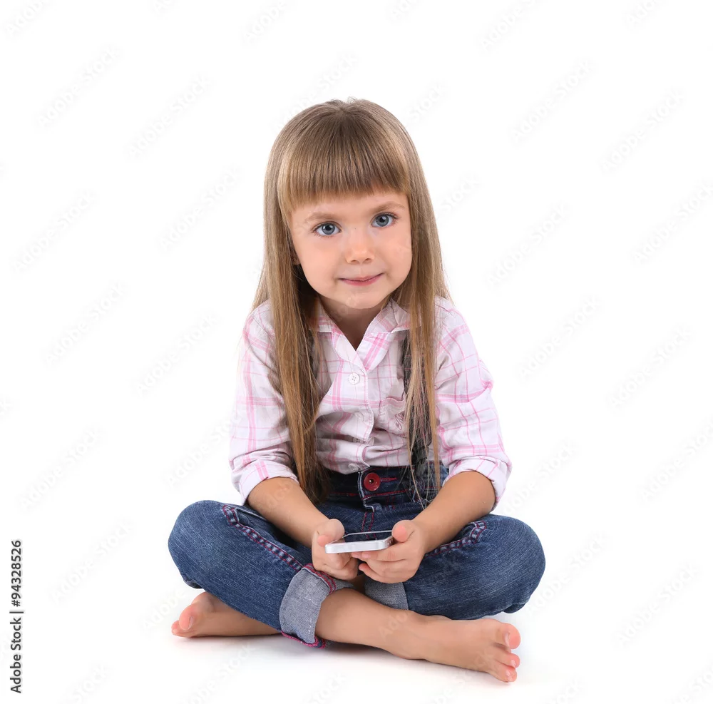 Beautiful little girl with mobile phone, isolated on white