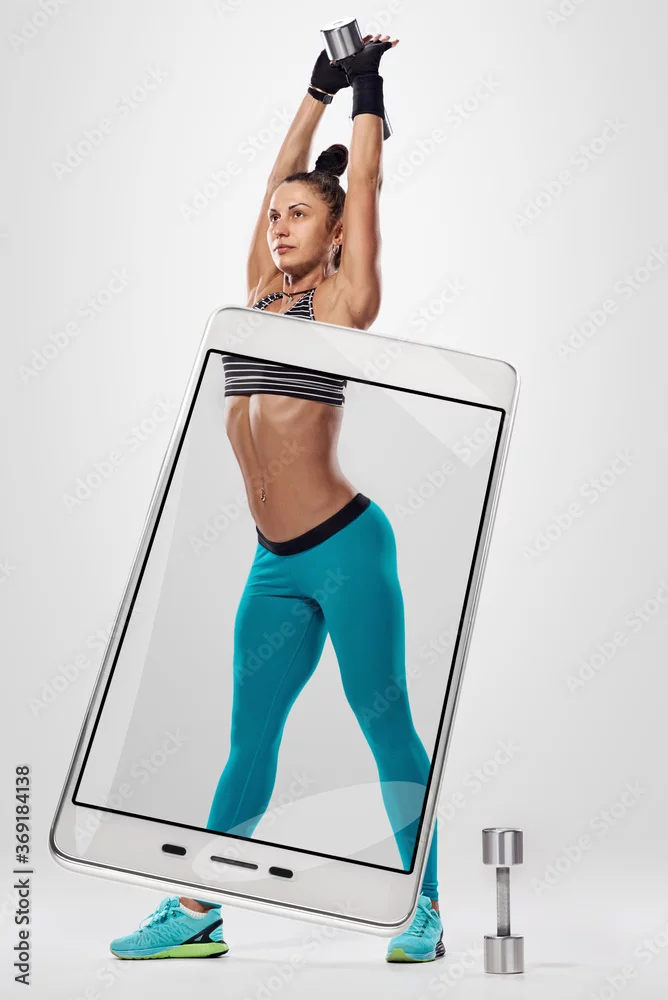 Beautiful muscular female body photographed on modern smartphone. conceptual collage with device
