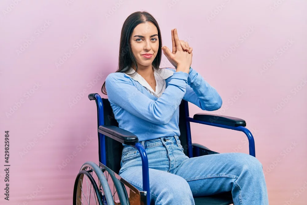 Beautiful woman with blue eyes sitting on wheelchair holding symbolic gun with hand gesture, playing killing shooting weapons, angry face