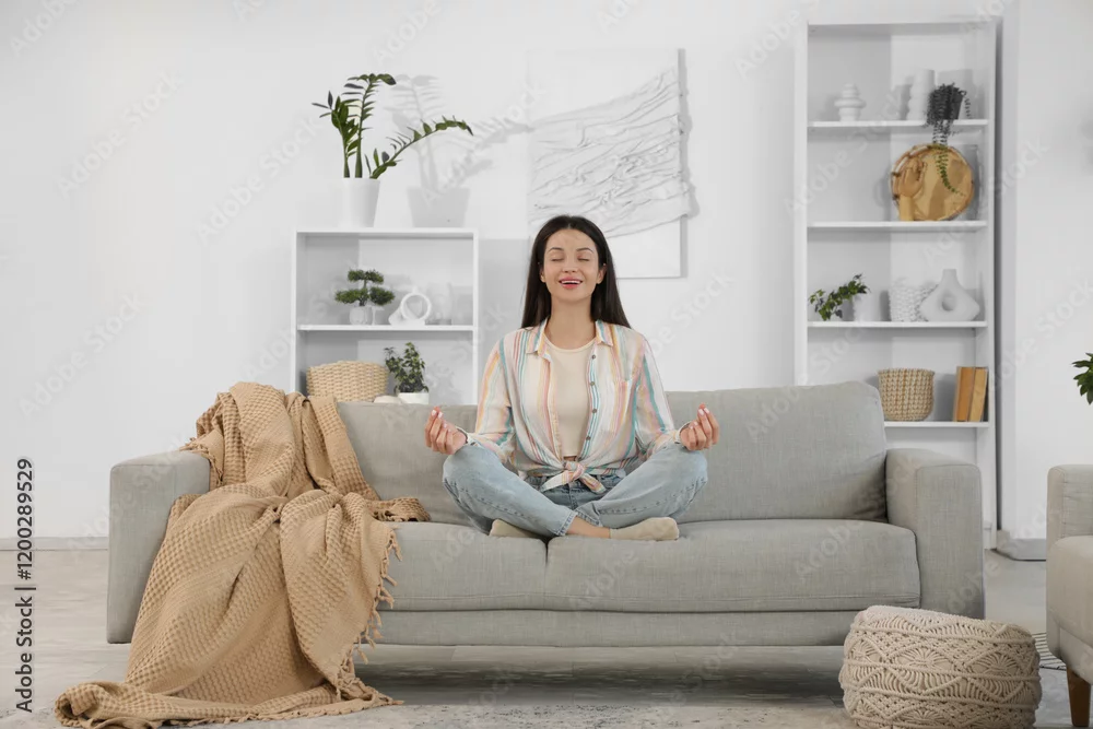 Beautiful young woman meditating on cozy sofa at home