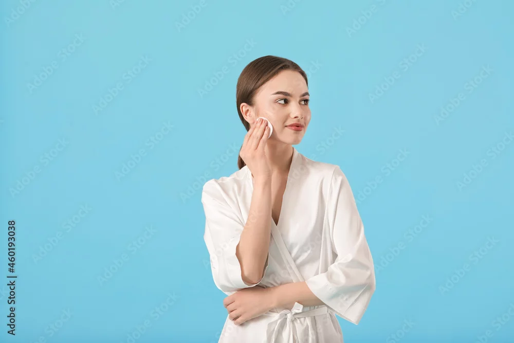 Beautiful young woman with cotton pad on color background