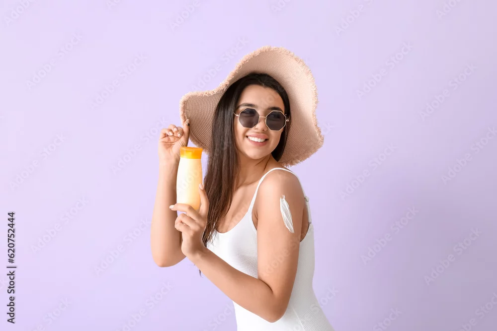 Beautiful young woman with sunscreen cream on lilac background