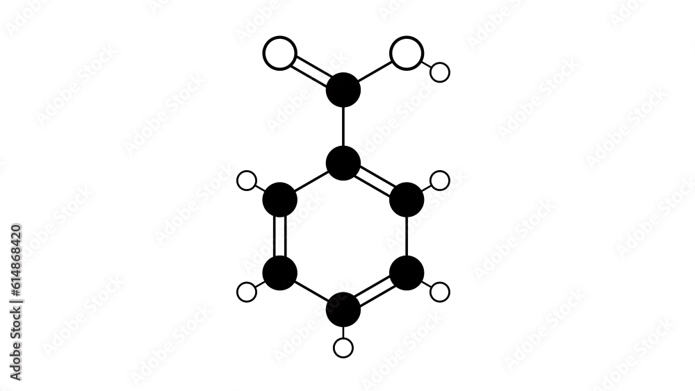 benzoic acid molecule, structural chemical formula, ball-and-stick model, isolated image aromatic carboxylic acid