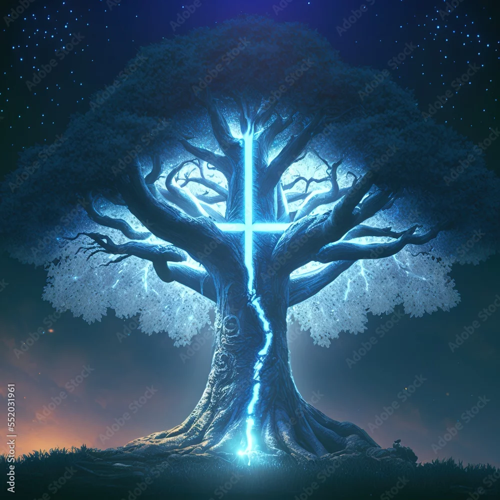 Big Realistic Ancient Tree Shining With Bright Blue Light In The Dark Showing The Beauty Of Nature Glow Ornaments Deep Learning 3d Illustration