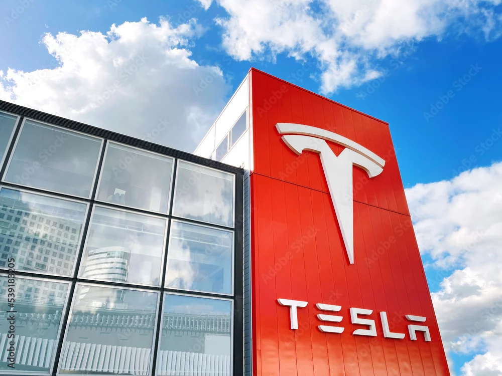 Big Tesla logo on building of the branch in Amsterdam, Netherlands