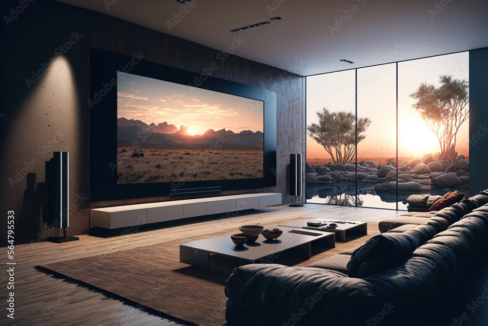Big TV wall screen in modern living room, television set in luxury interior, generative AI