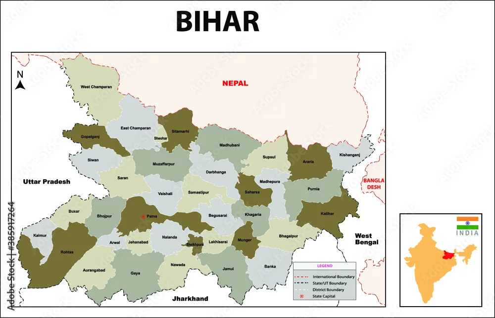 Bihar Map.Political map of Bihar District. Bihar map with gray color. Bihar map with border.