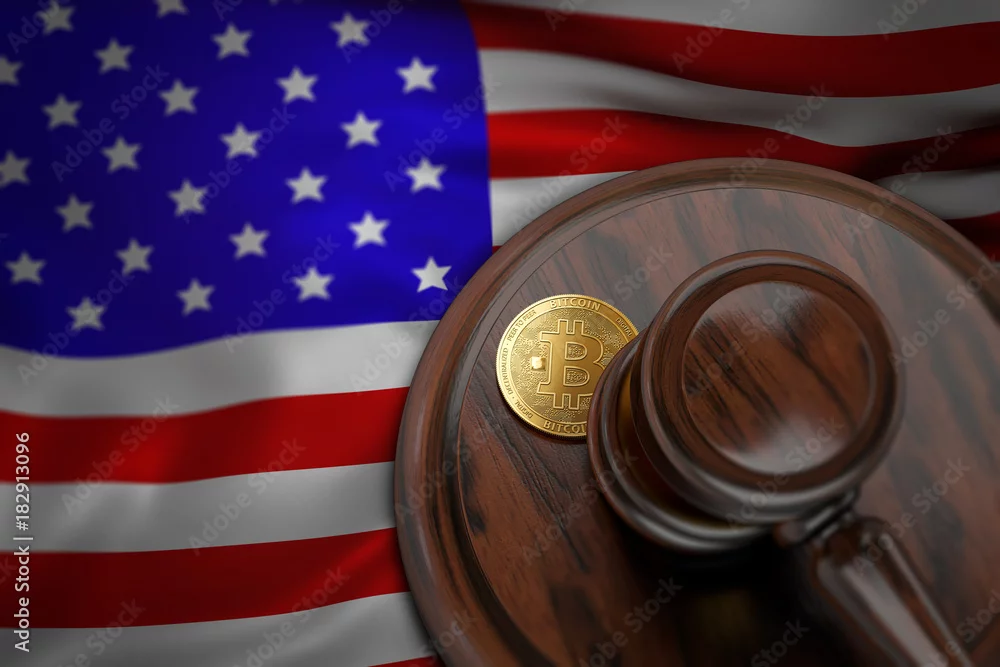 Bitcoin and judge gavel laying on flag of USA. Bitcoin legal situation in USA concept. 3D rendering