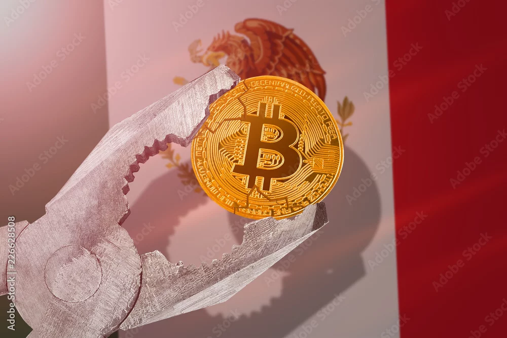 Bitcoin regulation in Mexico; bitcoin btc coin being squeezed in vice on Mexico flag background; limitation, prohibition, illegally, banned