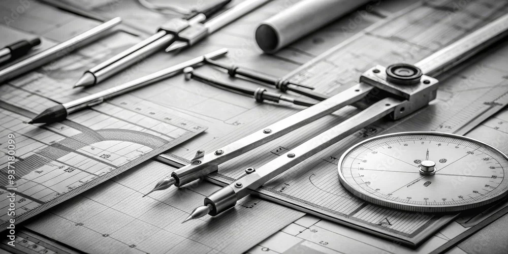 Black and White Still Life Composition of Drafting Tools on Graph Paper, Drafting Tools , Architectural Design, Technical Drawing, Design , drawing, blueprint