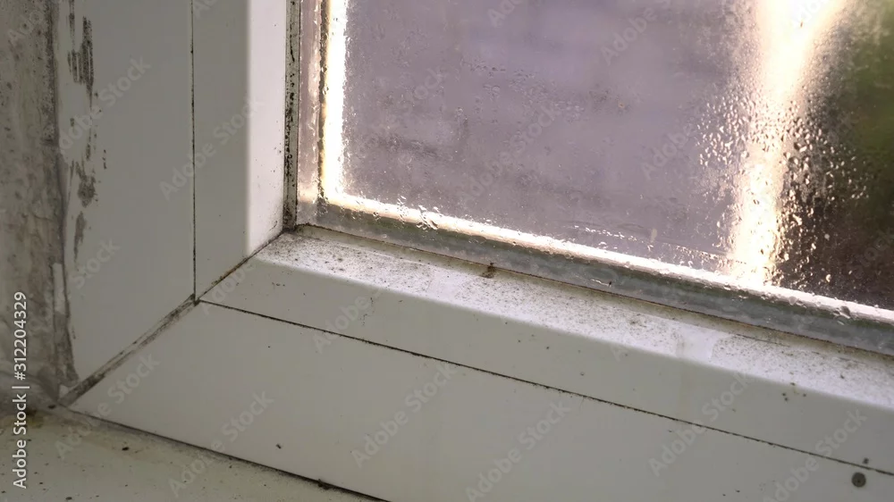 Black mold growth on window frame. Condensation on the glass. Moisture and Mold Problems. Mold or mould, mildew, is a fungal growth that develops on wet materials