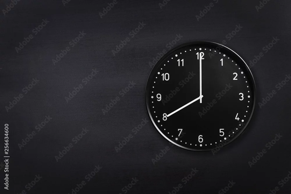 Black wall clock showing eight o'clock on black chalkboard background. Office clock showing 8am or 8pm on black texture