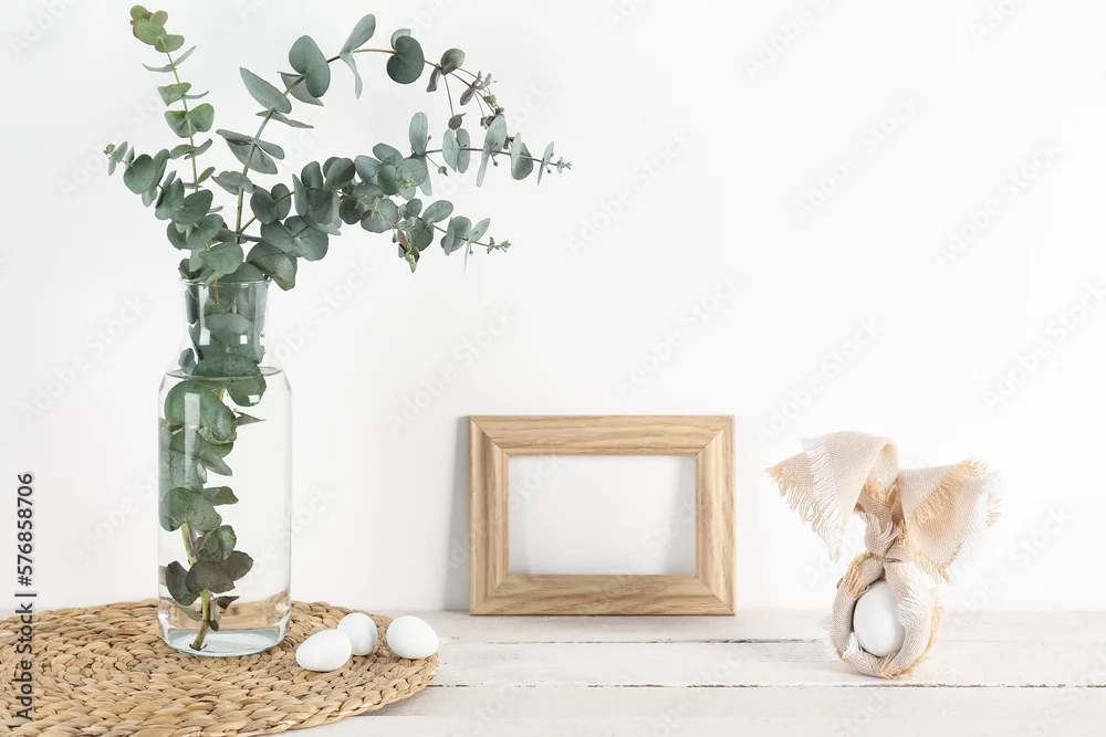 Blank frame, vase with eucalyptus and Easter eggs on table near white wall