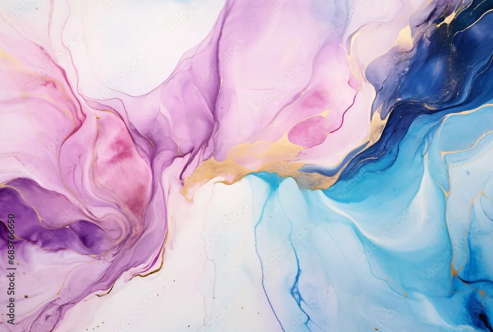 bluish and pink marble texture painting with gold details, fluid networks, light sky-blue and dark white, soft gradients
