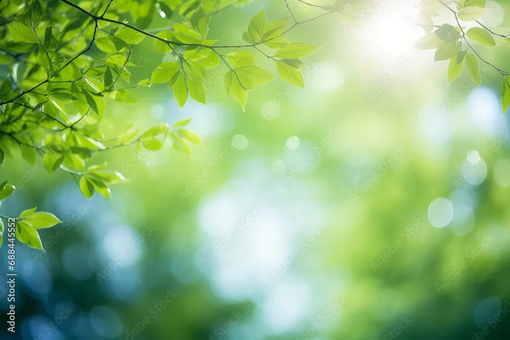 Blurred bokeh background of fresh green spring, summer foliage of tree leaves with blue sky and sun flare