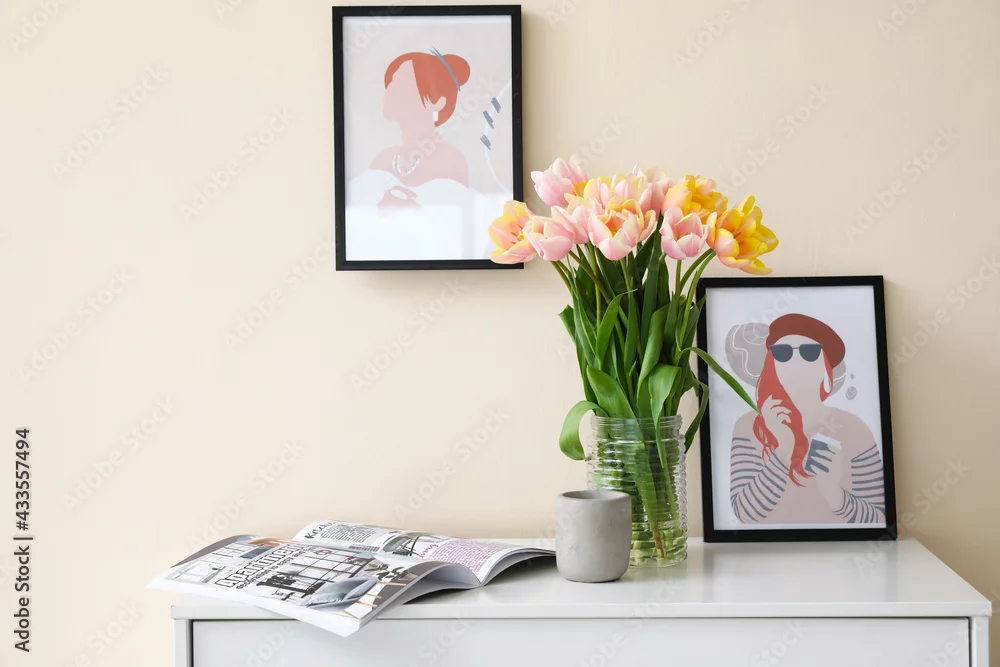Bouquet of tulip flowers and magazine on chest of drawers near color wall